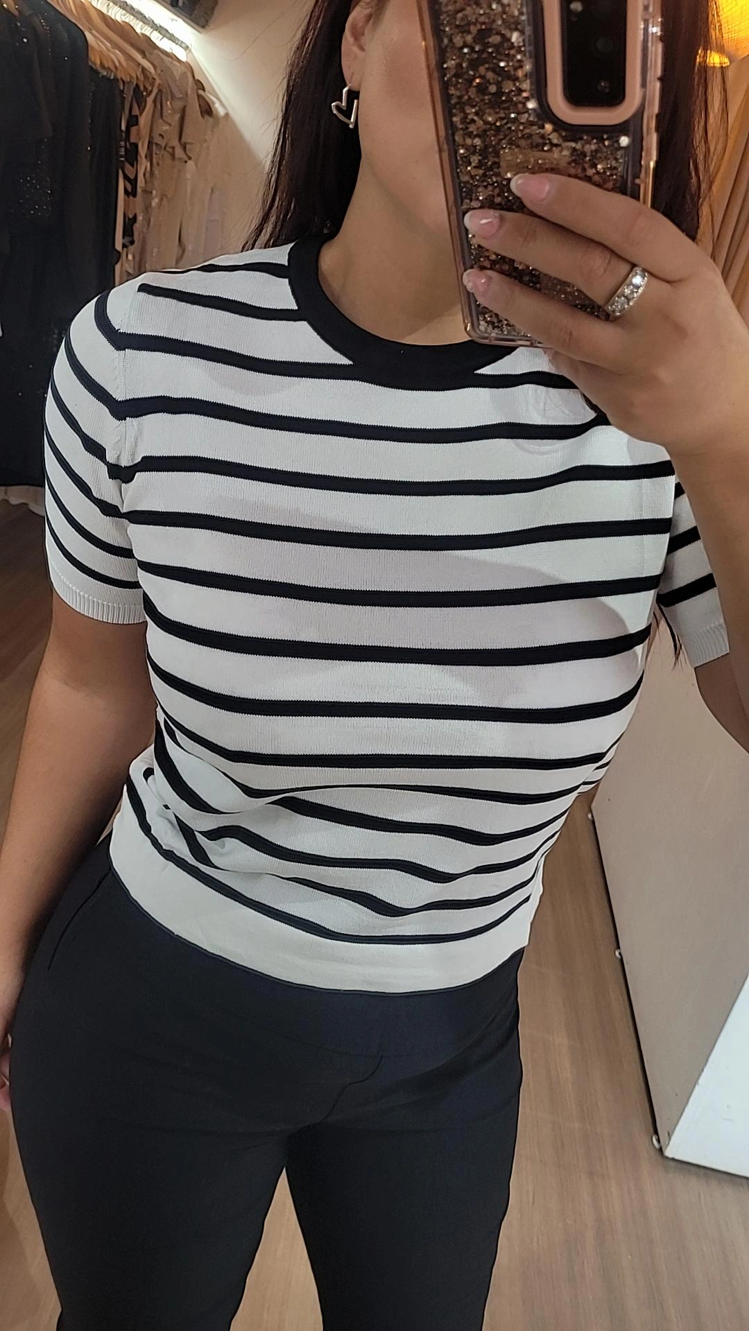 Blusa importada tejida de bremer, de diseño clásico y atemporal, ideal para quienes buscan elegancia sin esfuerzo. Presenta escote redondo y una delicada combinación en blanco con líneas negras, que aporta contraste, sofisticación y versatilidad.