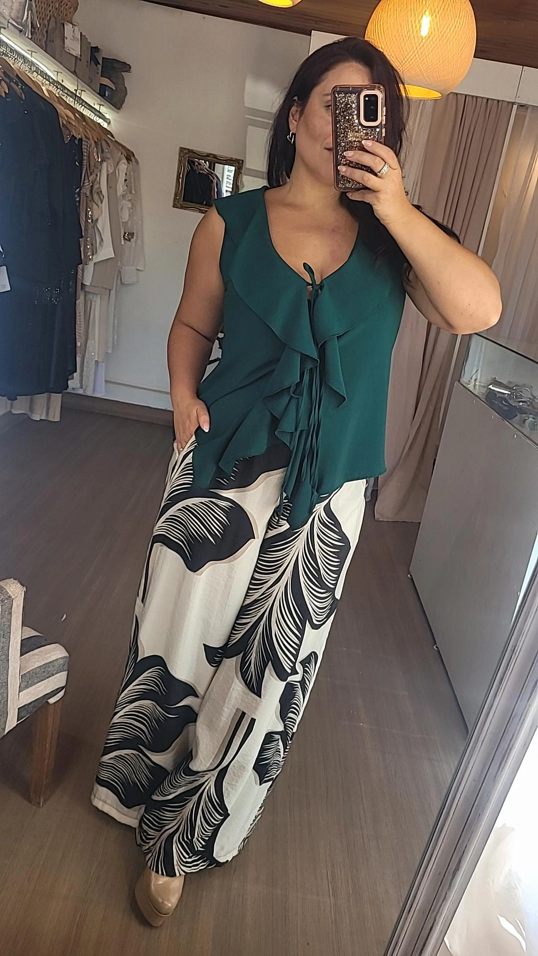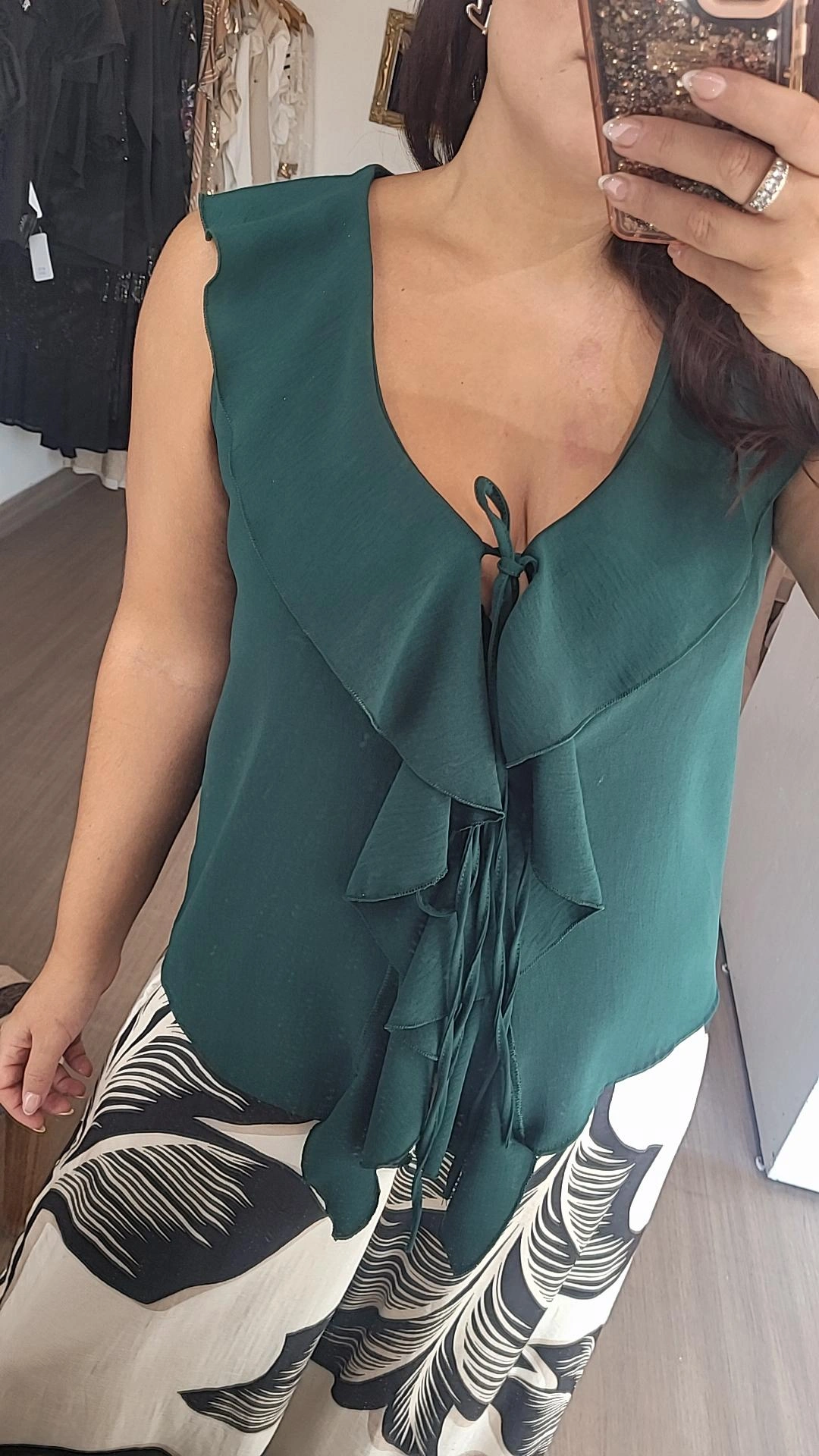 Blusa confeccionada en crep color verde inglés, con un diseño original y femenino. Presenta una apertura en la espalda, mientras que en la parte delantera se destaca un escote en V con dos tiras y detalles de vuelos a lo largo de la prenda, que aportan movimiento y un aire romántico.