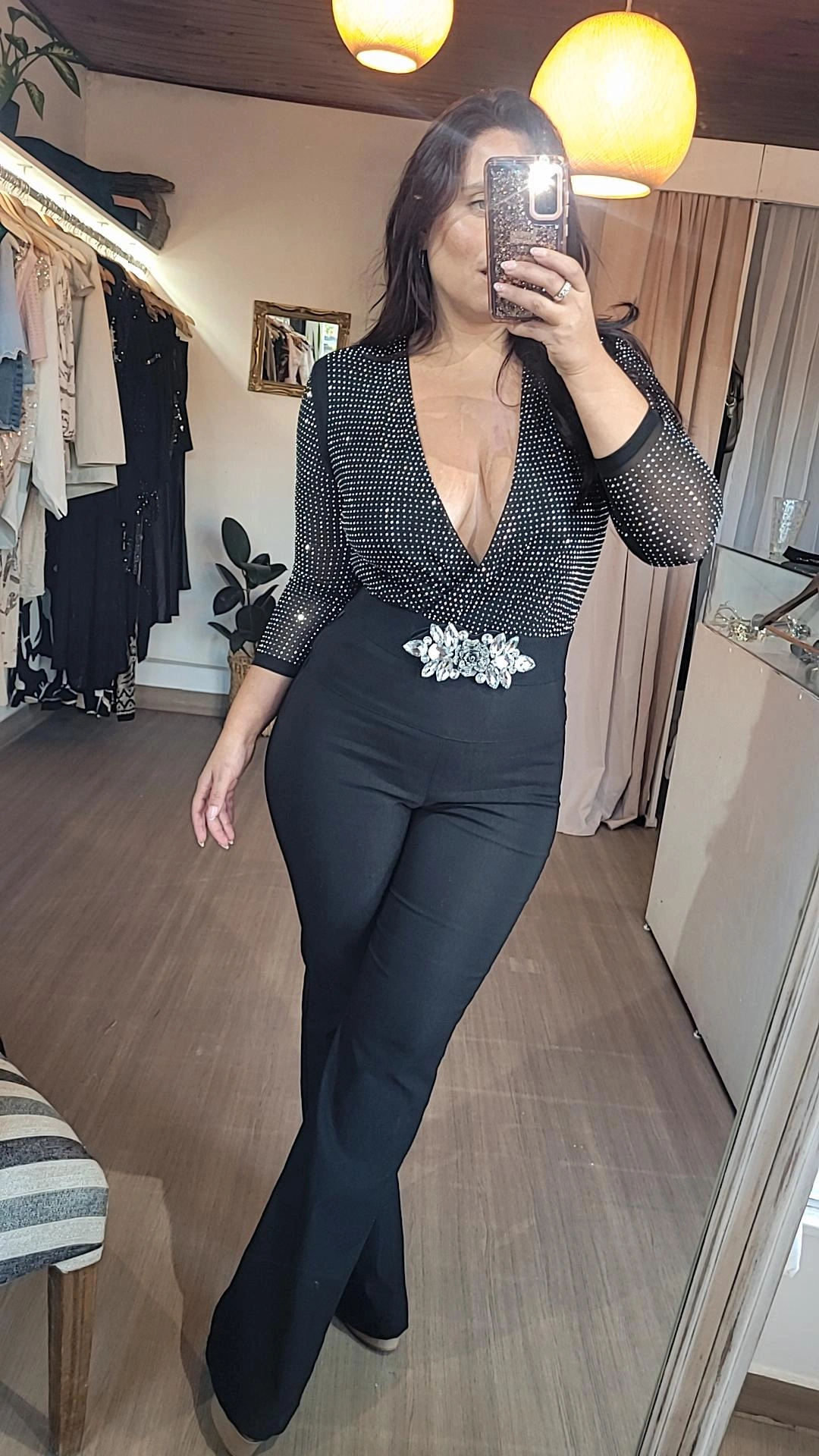 Presenta detalles de strass color plata en el frente y a lo largo de las mangas, logrando un equilibrio perfecto entre sofisticación y sensualidad.