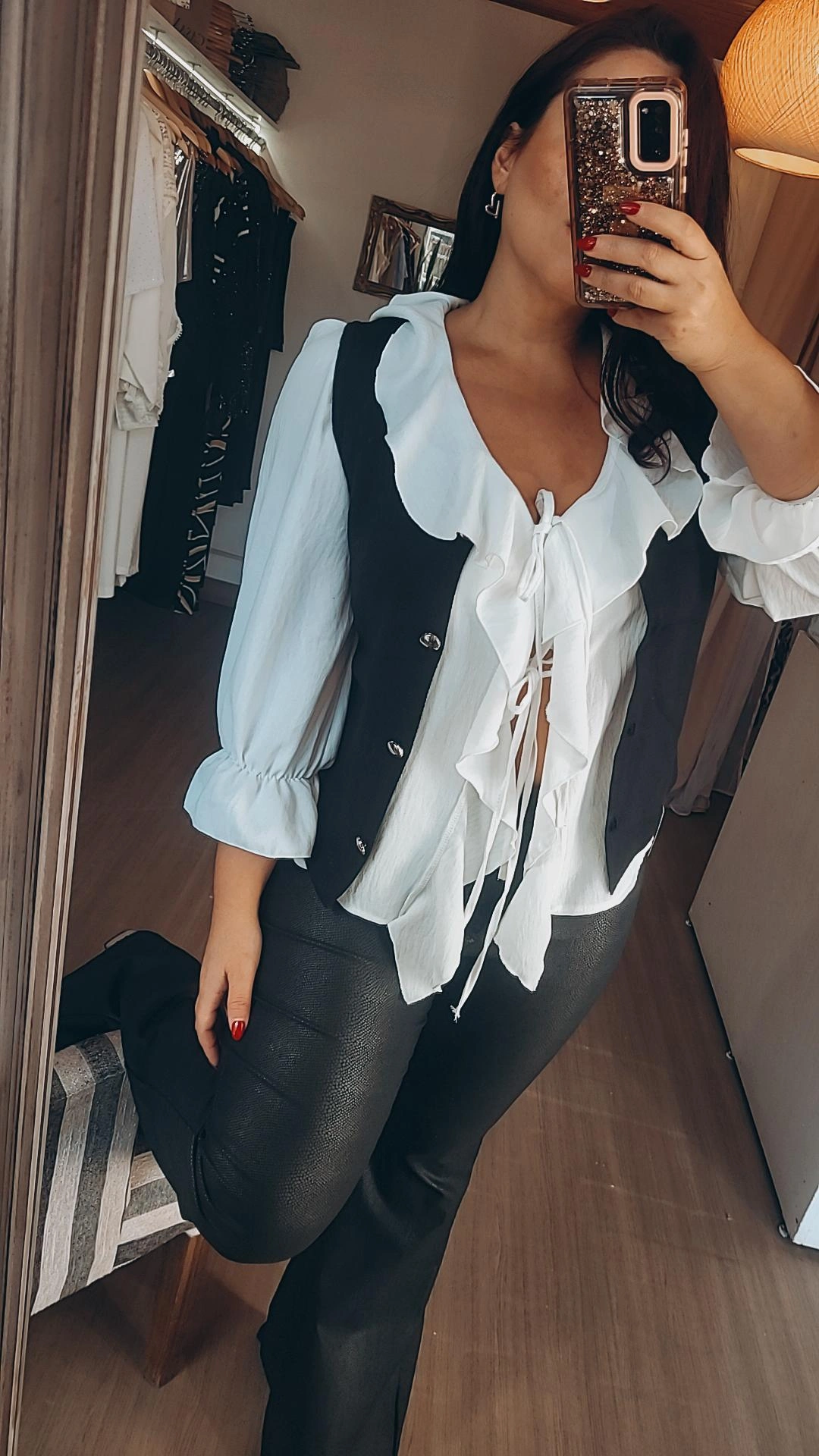 La prenda se cierra mediante dos tiras delanteras para atar, lo que permite usarla cerrada como blusa o abierta sobre otra prenda. Su corte suelto brinda un calce cómodo y versátil.