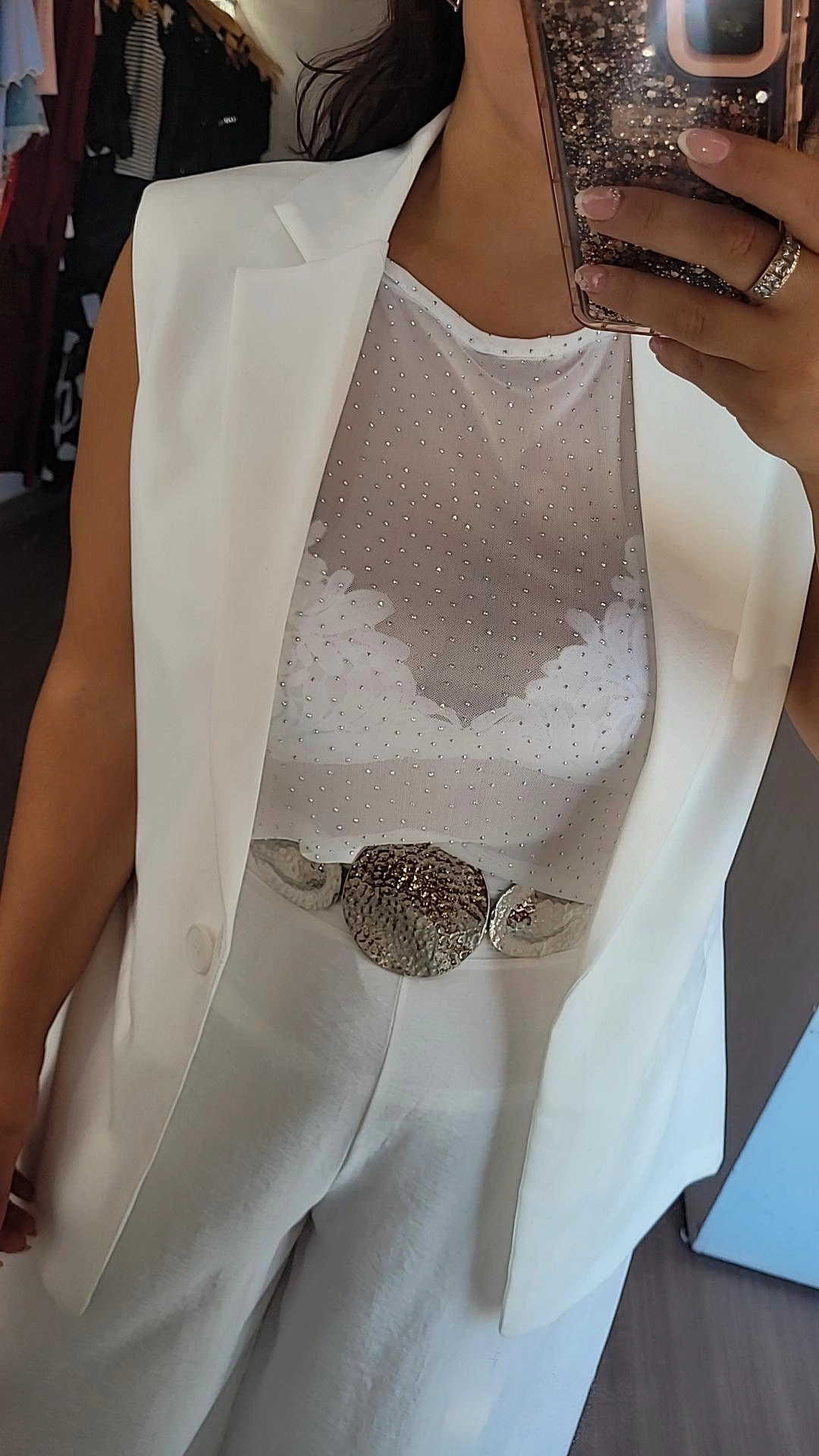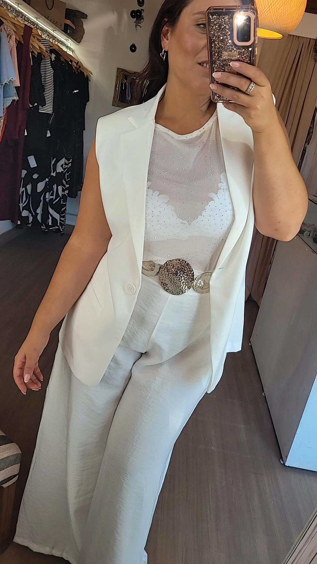 Chaleco largo de crep sastrero semielastizado, de líneas limpias y sofisticadas. Presenta un corte evasé que estiliza la silueta y hombreras que aportan estructura y presencia. Se cierra al frente con botón a tono, logrando un diseño minimalista y elegante, ideal para elevar looks tanto formales como urbanos. Una prenda versátil para usar sola o en capas, perfecta para un estilo moderno y pulido.