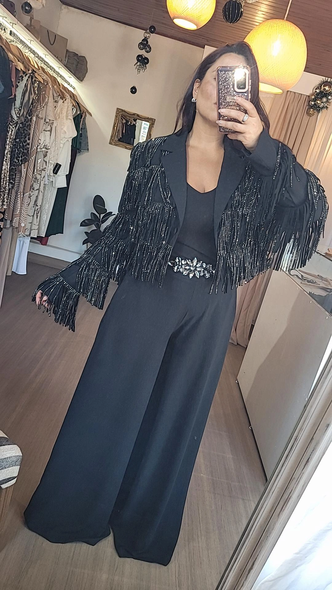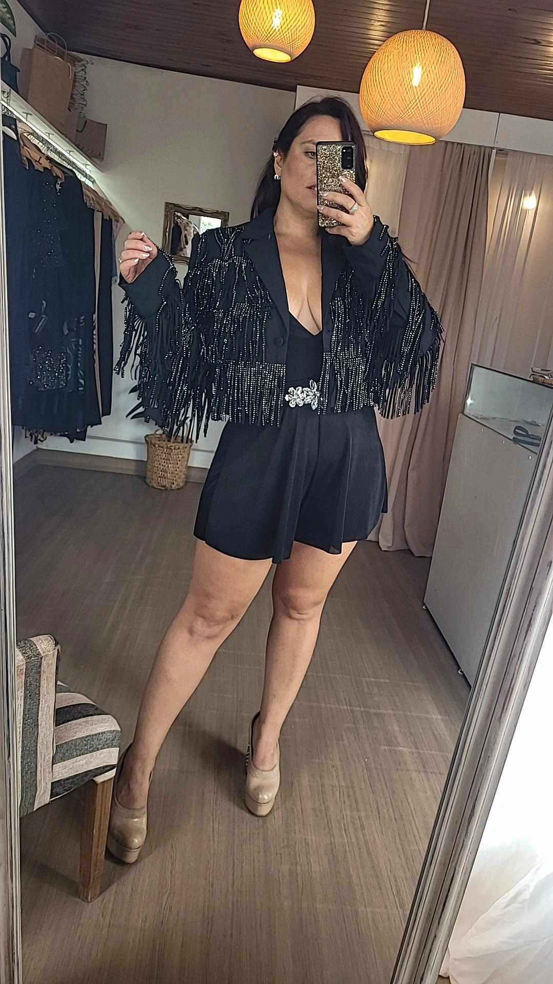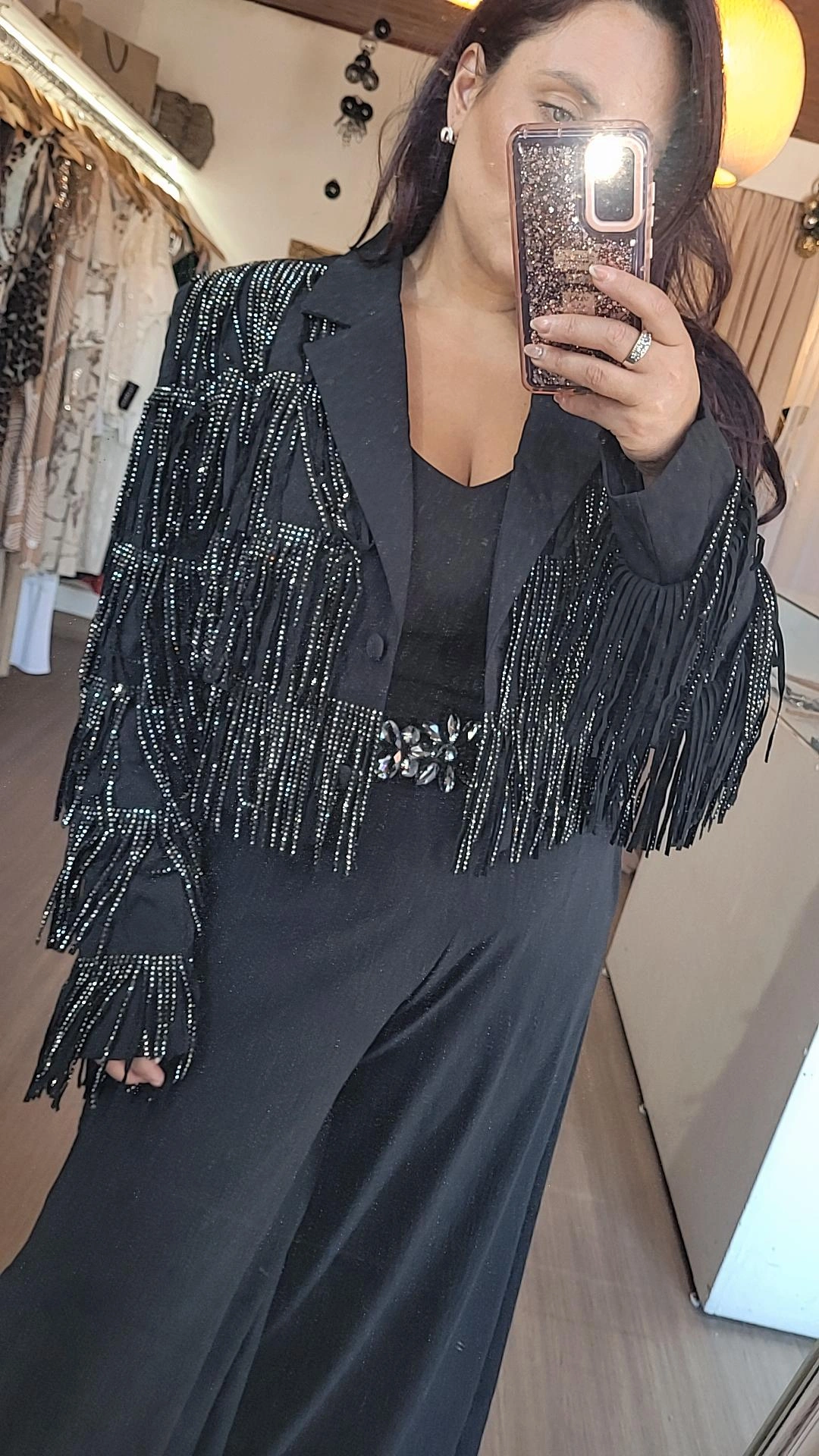 Presenta delicados flecos de strass color plata en toda la parte delantera y mangas, que aportan brillo y movimiento con cada gesto.