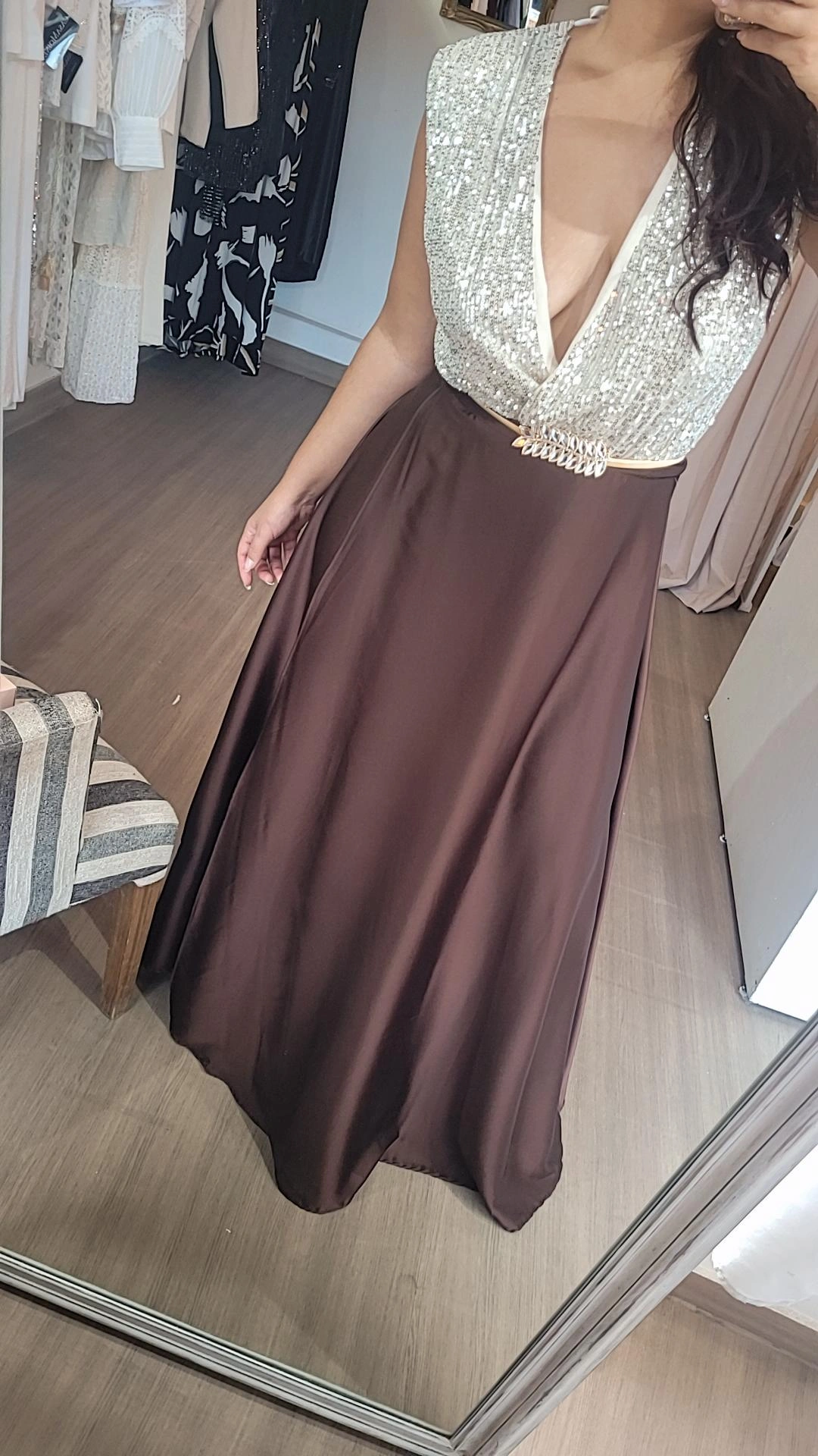 Falda tipo pareo confeccionada en tela satén con sutil brillo, de corte A, amplia y fluida. Se ata alrededor de la cintura, lo que permite adaptarse cómodamente a diferentes talles y siluetas. Su diseño versátil permite usarla tanto como falda protagonista como combinada con tops, blusas o bodies logrando el efecto visual de un vestido largo. Aporta movimiento y elegancia al caminar gracias a su amplitud inferior. Ideal para looks de noche sofisticados,