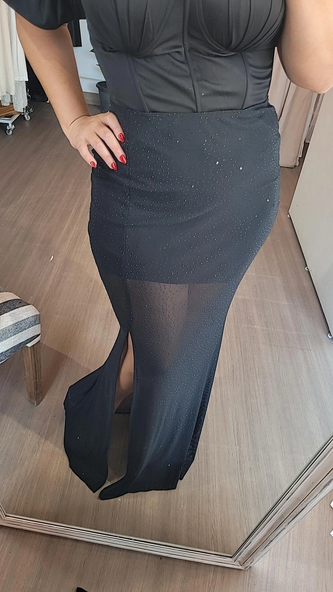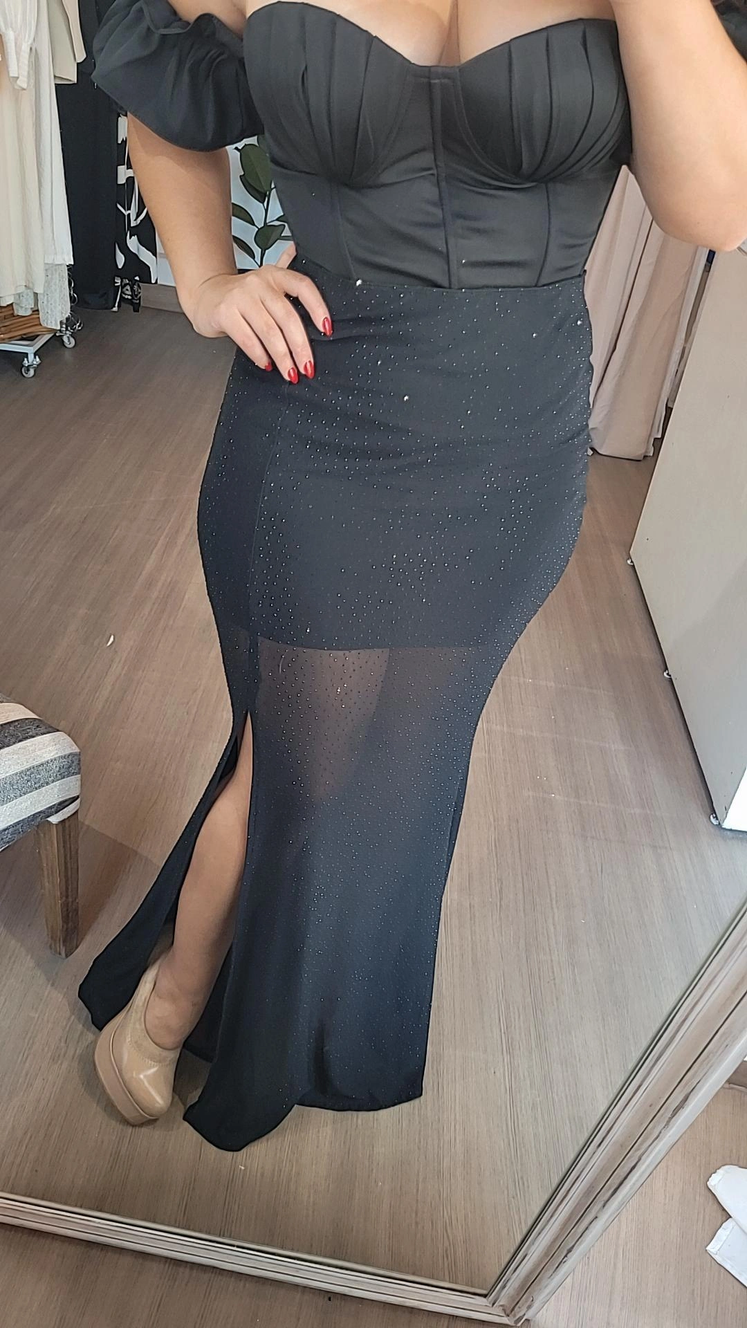 Está completamente intervenida con strass negro a tono, generando un brillo sutil y sofisticado que acompaña cada movimiento. En su interior cuenta con forro corto, aportando comodidad y contraste visual, mientras que el tajo lateral del lado izquierdo suma un detalle audaz que estiliza y aporta dinamismo.