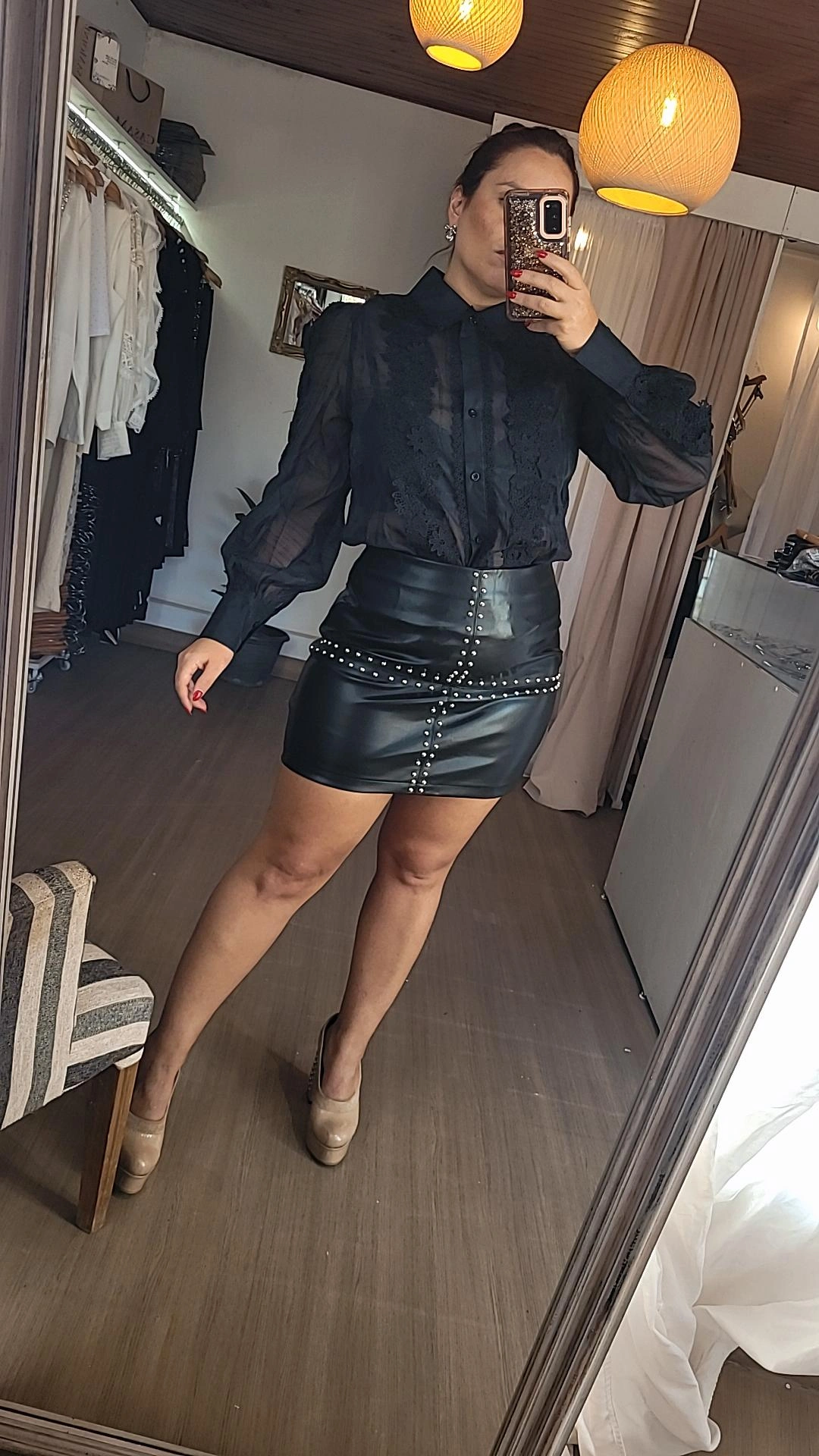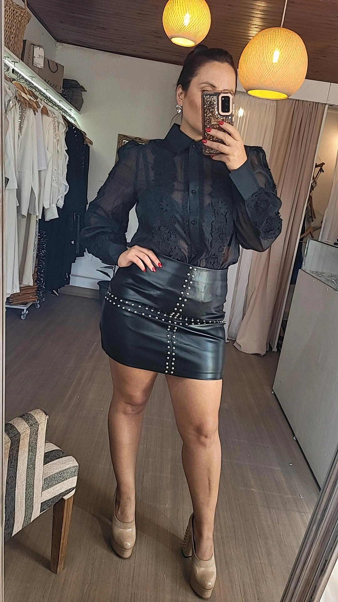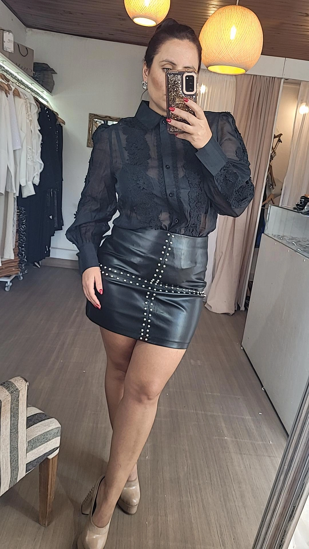 Minifalda confeccionada en tela engomada color negro, de estructura firme y calce entallado. El diseño presenta doble tira de tachas plateadas formando una cruz en la parte delantera, detalle que aporta un estilo moderno y distintivo.