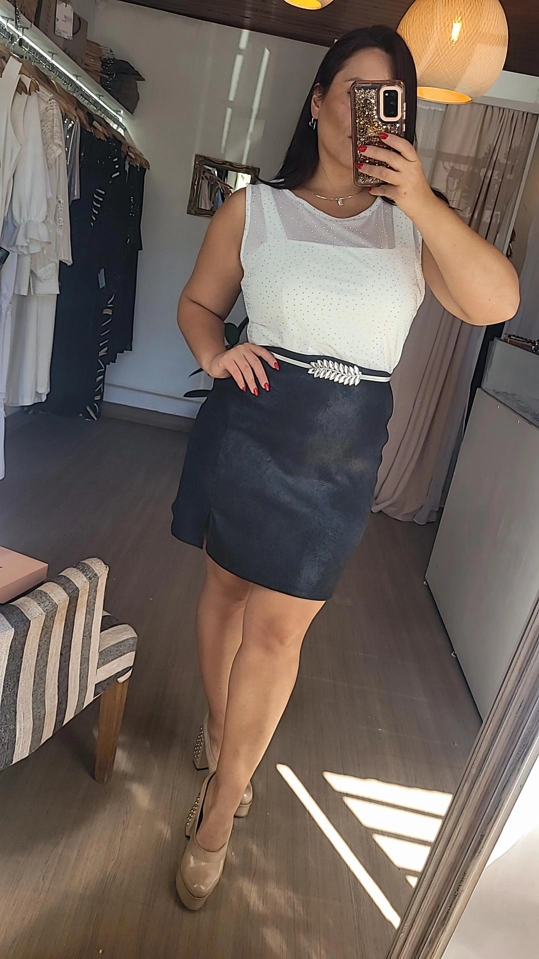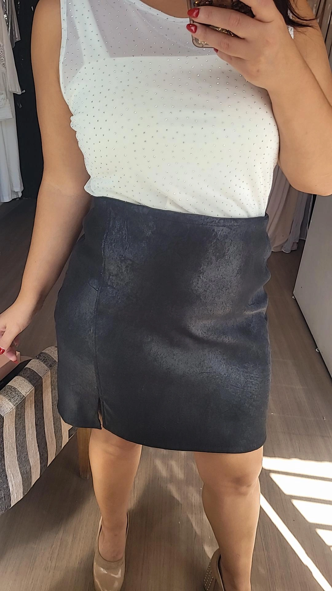 Minifalda confeccionada en tela elastizada color negro, de tiro alto y diseño clásico. Presenta cierre en la parte trasera y pequeño tajo en la pierna izquierda, detalle que aporta mayor comodidad al caminar.