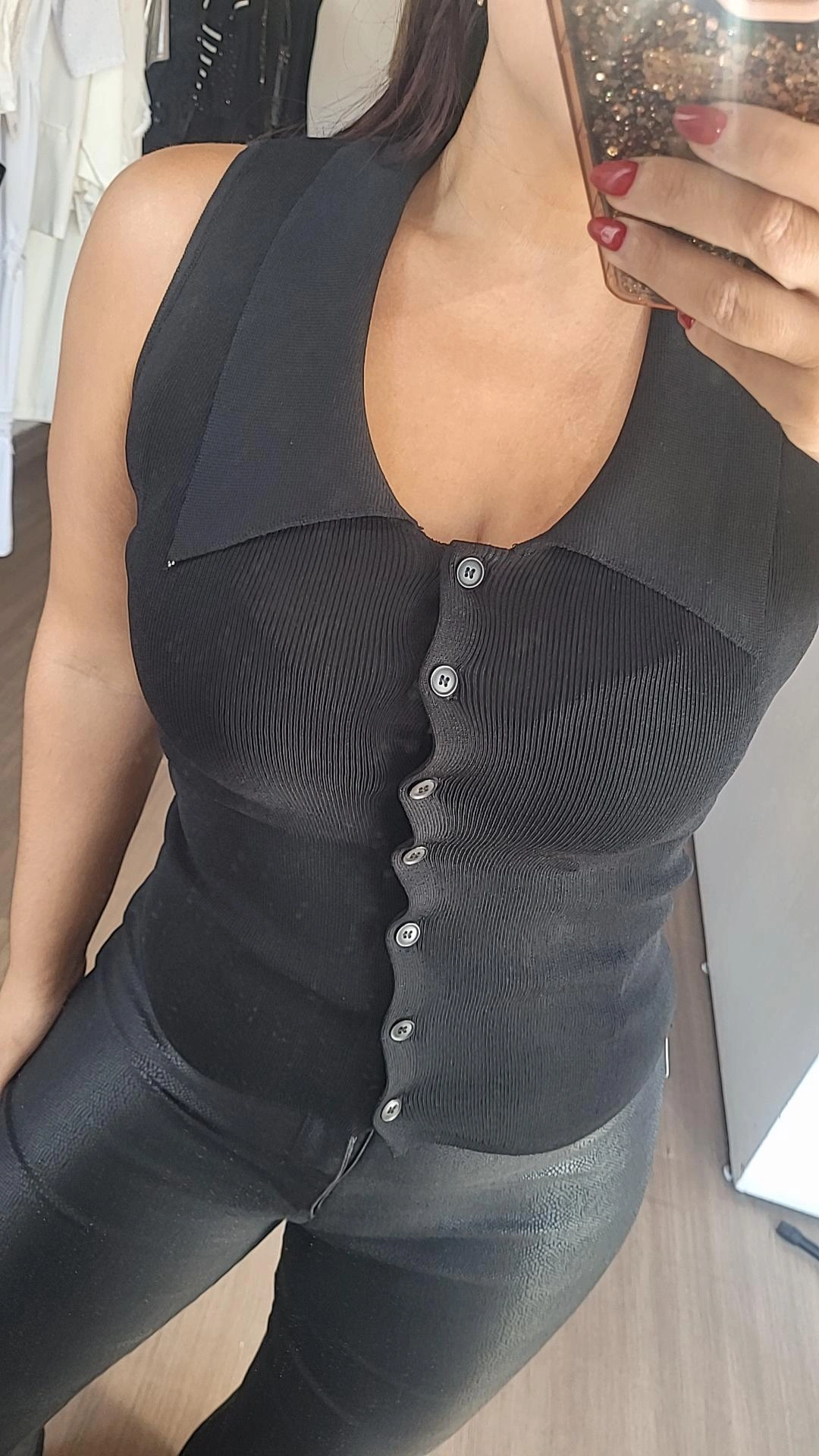 Musculosa chaleco importada confeccionada en tejido bremer elastizado, de textura suave y calce adaptable. Su diseño permite usarla cerrada como musculosa o abierta como chaleco sobre otra prenda.