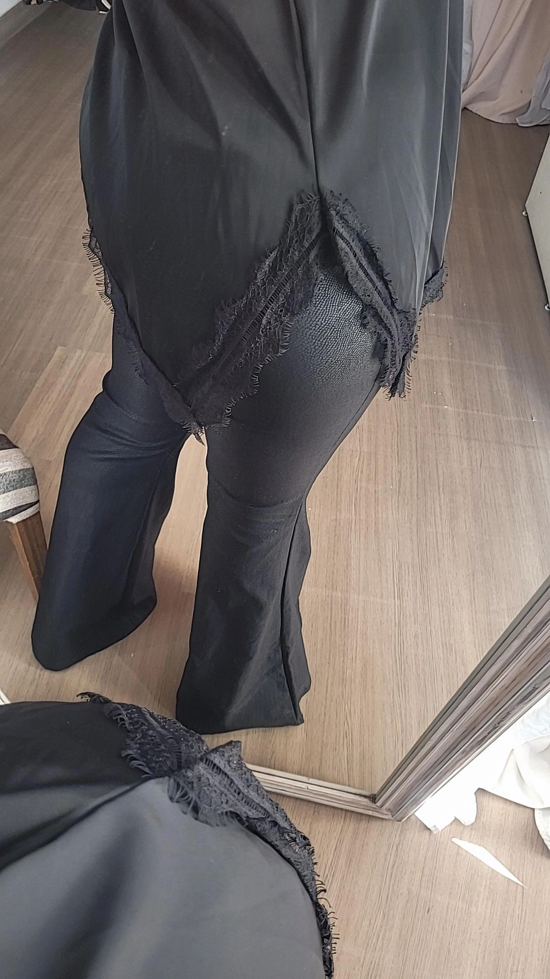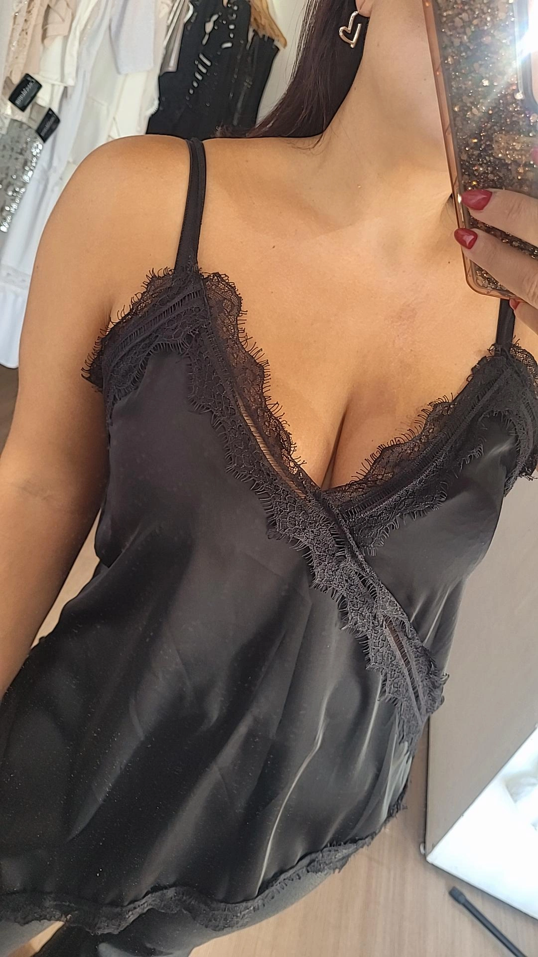 Musculosa lencera confeccionada en satén fino, combinada con detalle de encaje a tono. Presenta corte desigual, que aporta movimiento y un acabado delicado.