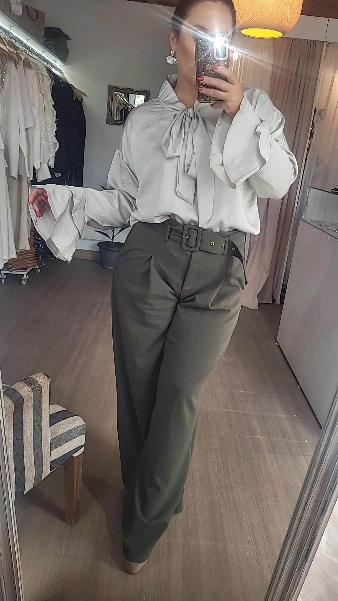 Palazo confeccionado en crep sastrero color verde oliva, de caída recta y estructura cómoda. Incluye cinto del mismo tejido a tono, que permite ajustar y definir la cintura.