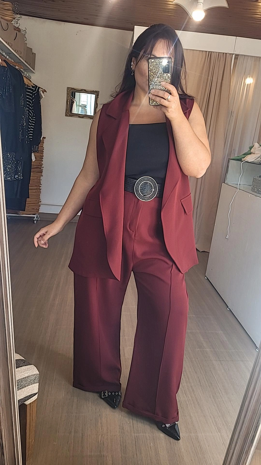 El set Bordeaux es una propuesta sofisticada y moderna diseñada especialmente para realzar la figura con comodidad y estilo. Confeccionado en crepé sastrero color bordo, combina un chaleco amplio y un pantalón clásico con detalles cuidadosamente pensados para lograr un look elegante y actual. Ideal para mujeres que buscan prendas versátiles, cómodas y con presencia.