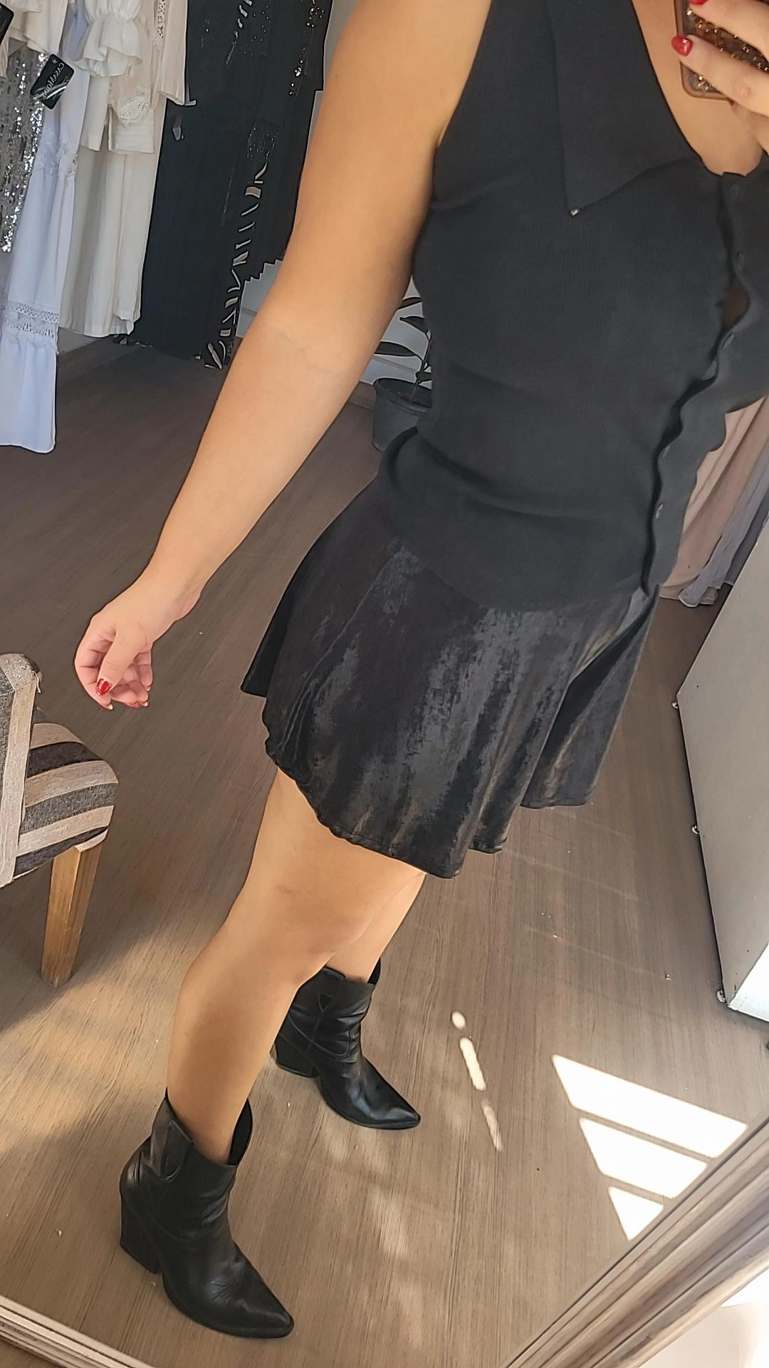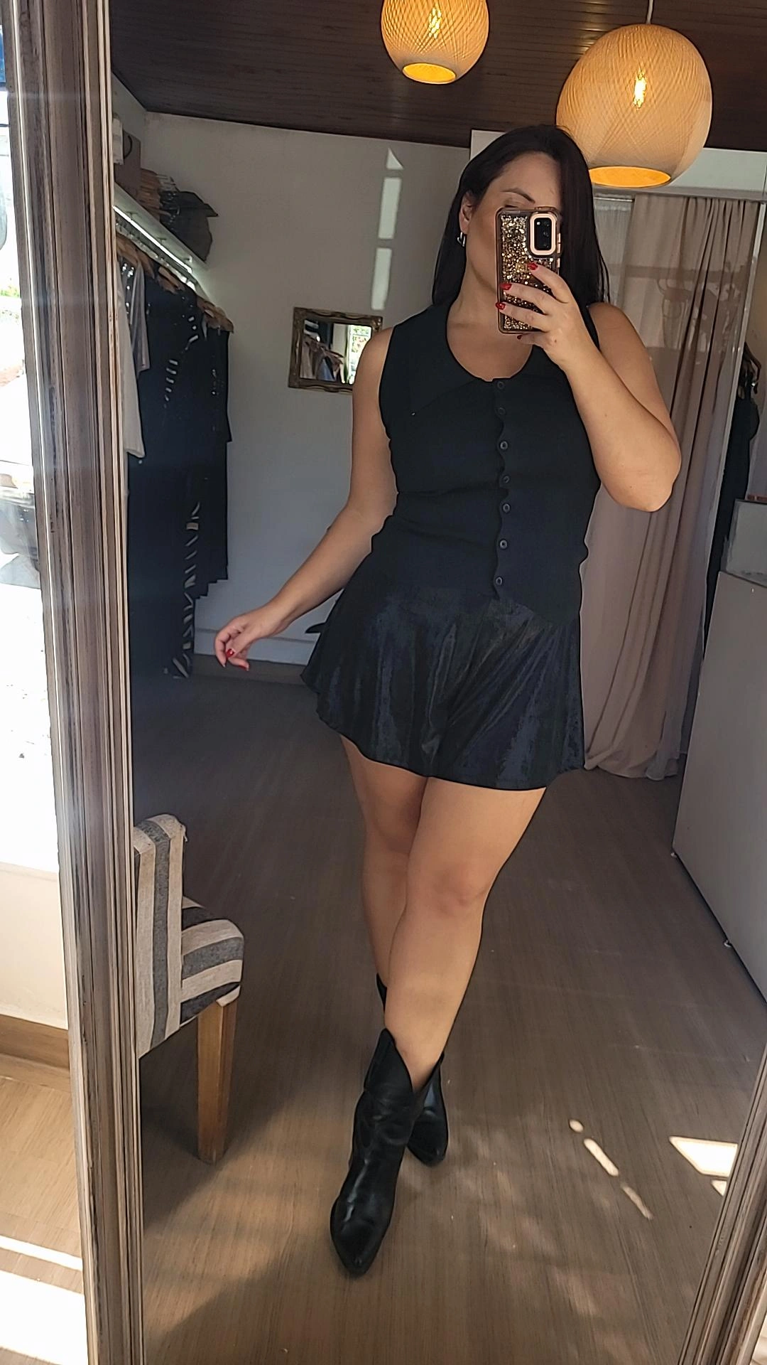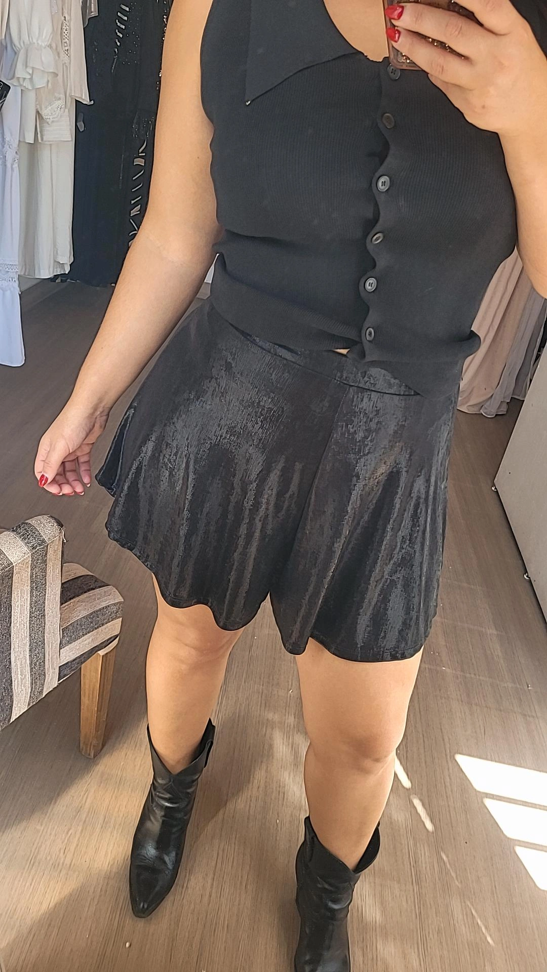 Short confeccionado en tela liviana color negro, de corte suelto estilo pollera que aporta movimiento y comodidad. Presenta detalle de foile a tono, generando un brillo sutil en la prenda.