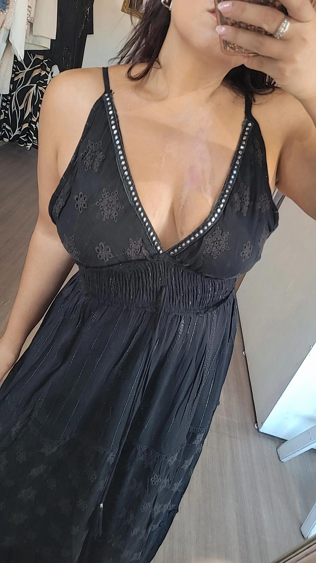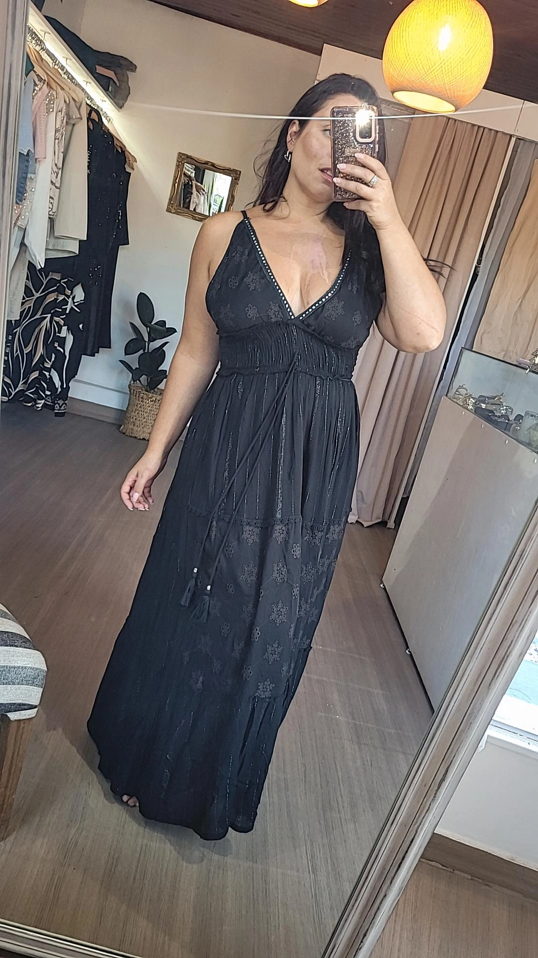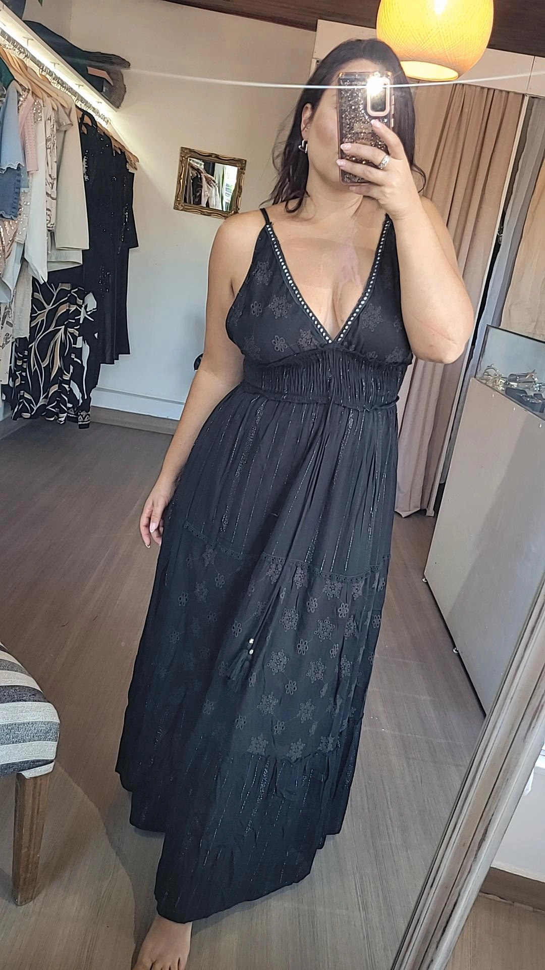 Vestido estilo hindú color negro, confeccionado con una combinación de telas que aportan textura y sofisticación.